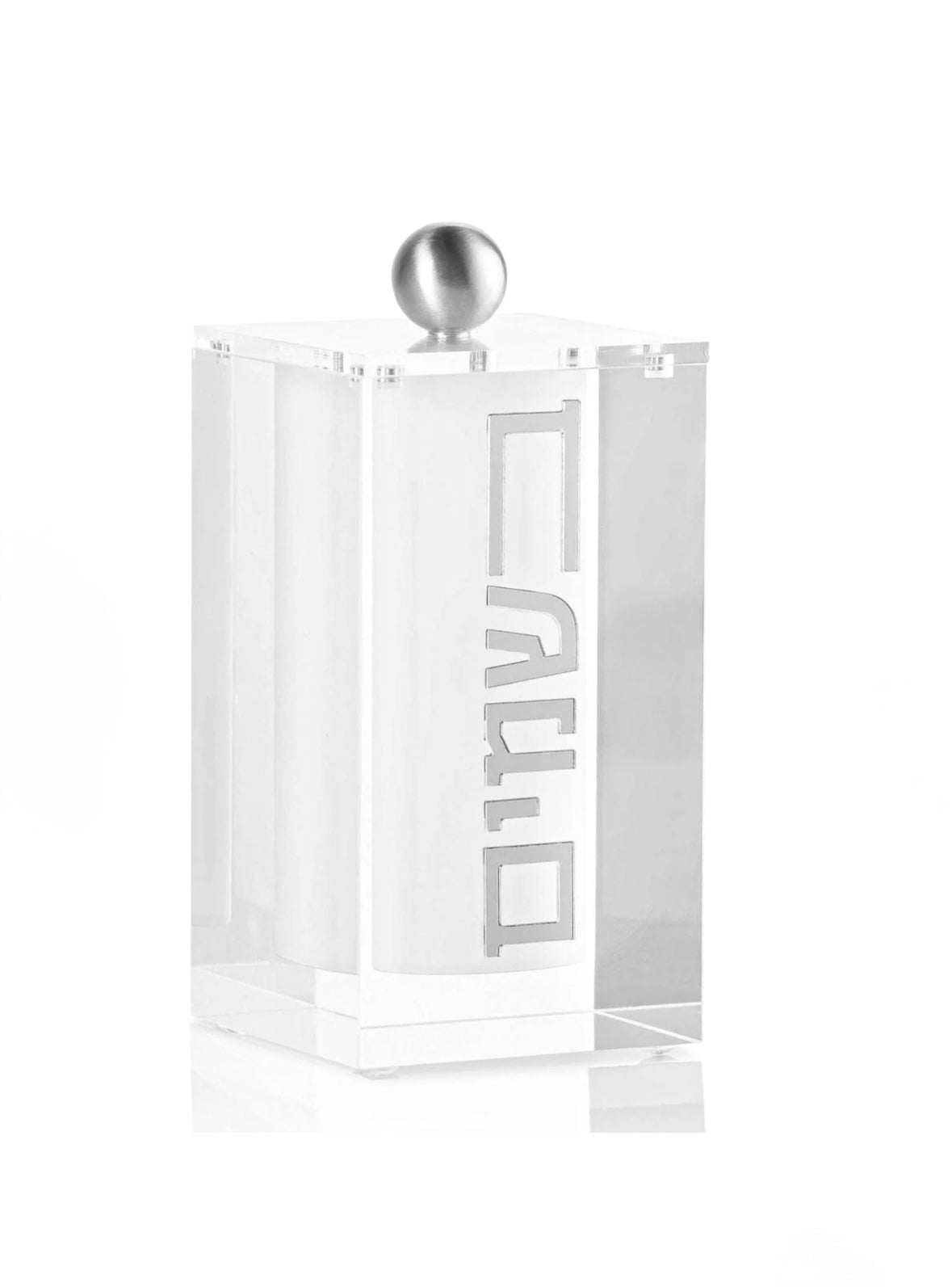 This magnificent luxe Lucite Besamim Holder will make a striking addition to your Havdalah table. Features clear thick lucite, die-cut silver metal words, and a strong magnetic cover. Both practical and beautiful, this Besamim holder would make a great gift. Coordinate with the matching match holder.