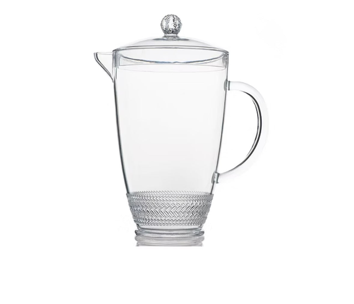 With a fitted lid and spout, this pitcher is a study in contrasts, featuring Old World motif of French basket weaving in modern acrylic