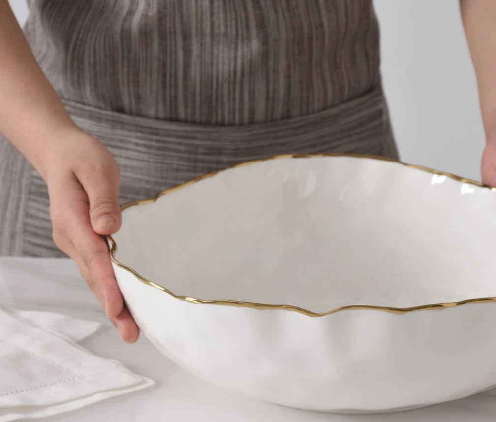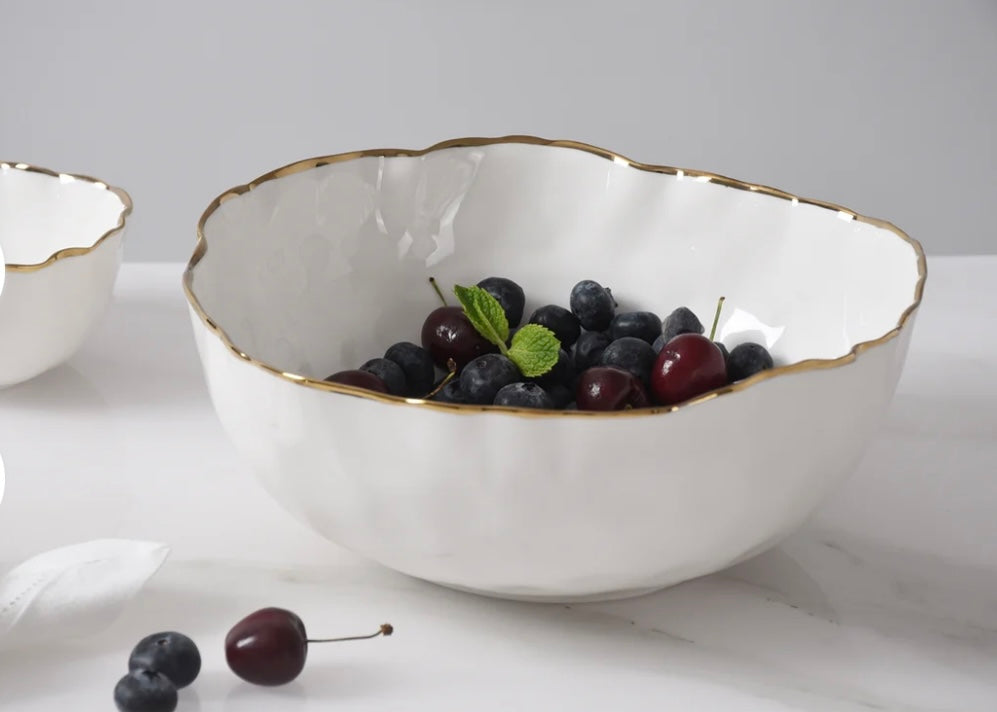 Generously sized bowls for serving salads or side dishes like mashed potatoes, roasted vegetables, or rice! Gorgeous white porcelain with a delicate gold trim. Food safe, tarnish free, dishwasher safe, oven safe to 500°. Easy Care.