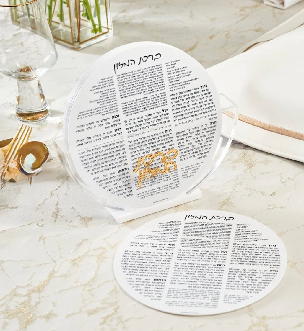 Luxurious white Lucite Bencher Cards in a modern round clear holder with mirrored words. Double sided White lucite with Al Hamichya & Borei Nifashos, Easy to read. Wipe clean. Looks Great Personalized!!!!